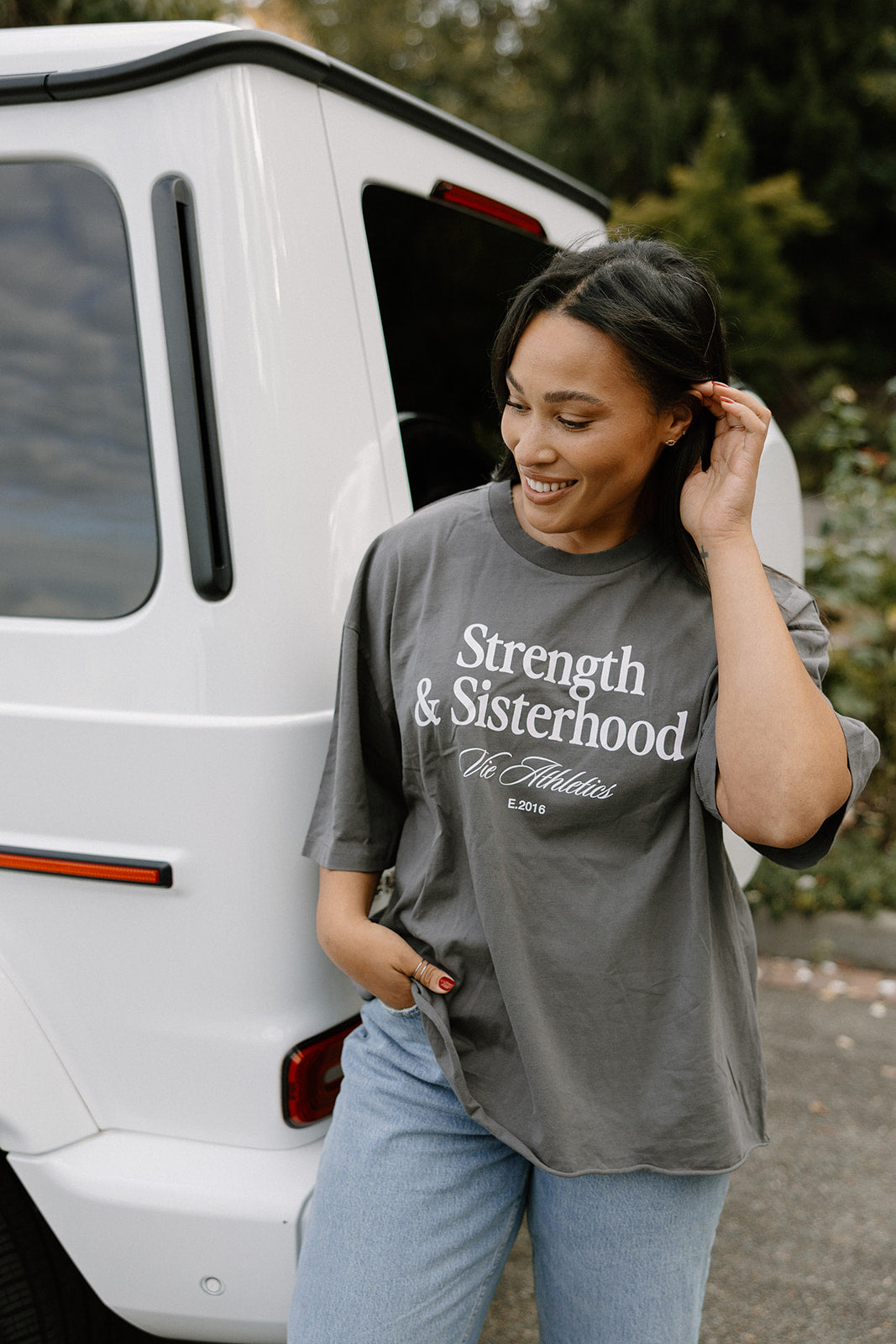 For the woman who finds her strength in others. The Sisterhood Tee has an oversized silhouette and vintage charcoal wash creating that perfectly broken-in feel, while the bold Strength & Sisterhood print reminds you what we’re built on. Easy to style and impossible to forget, this tee moves with you from gym days to coffee dates with your girls.